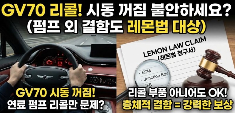 Q(질문): 2023년식 제네시스 GV70 2.5T 차주 입니다. 뉴스에서 GV70 연료 펌프(Fuel Pump) 리콜 터졌다는 소식은 들었는데, 제 차는 좀 상황이 다릅니다. 주행 중에 시동이 꺼질 뻔해서 센터에 갔더니, 연료 펌프 문제는 아니고 엔진 컴퓨터(ECM)랑 정션 박스(Junction Box)가 타버렸다고 하네요. 리콜 대상 부품이 아니니까 레몬법 보상은 못 받는 건가요? 똑같이 가다가 서는 증상인데 너무 불안합니다.