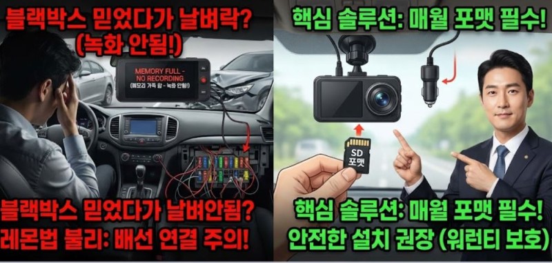 A (답변): 안녕하세요, 교통사고/레몬법 전문 최미수 변호사 법률 사무실입니다. 안타깝지만, 상담하다 보면 10명 중 3명은 겪으시는 일입니다. 많은 분들이 블랙박스를 한번 달아두면 알아서 되는 기계라고 생각하시지만, 사실은 주기적인 관리가 필수입니다. 교통사고와 레몬법을 모두 다루는 변호사로서, 블랙박스 관리 & 설치의 핵심 2가지를 알려드립니다.