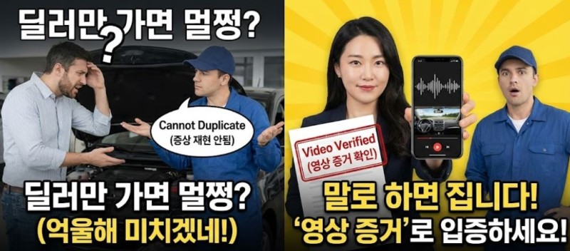 Q (질문): 진짜 억울해서 잠이 안 옵니다. 제 차가 아침마다 엔진에서 이상한 굉음이 나거든요? 그래서 딜러십에 갔는데, 이틀 뒤에 연락 와서 하는 말이 가관입니다. "테스트해봤는데 소리 안 나는데요? 손님, 차는 정상입니다. 그냥 타세요." (Could Not Duplicate) 벌써 세 번째입니다. 제가 탈 땐 분명히 소리가 나는데, 거기만 가면 멀쩡해져요. 딜러는 제가 예민하다고 몰아가는데, 증상이 안 나타나면 레몬법도 못 하는 건가요?