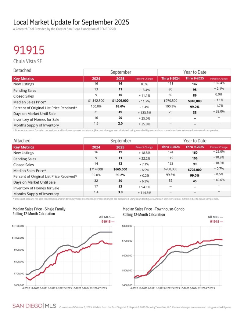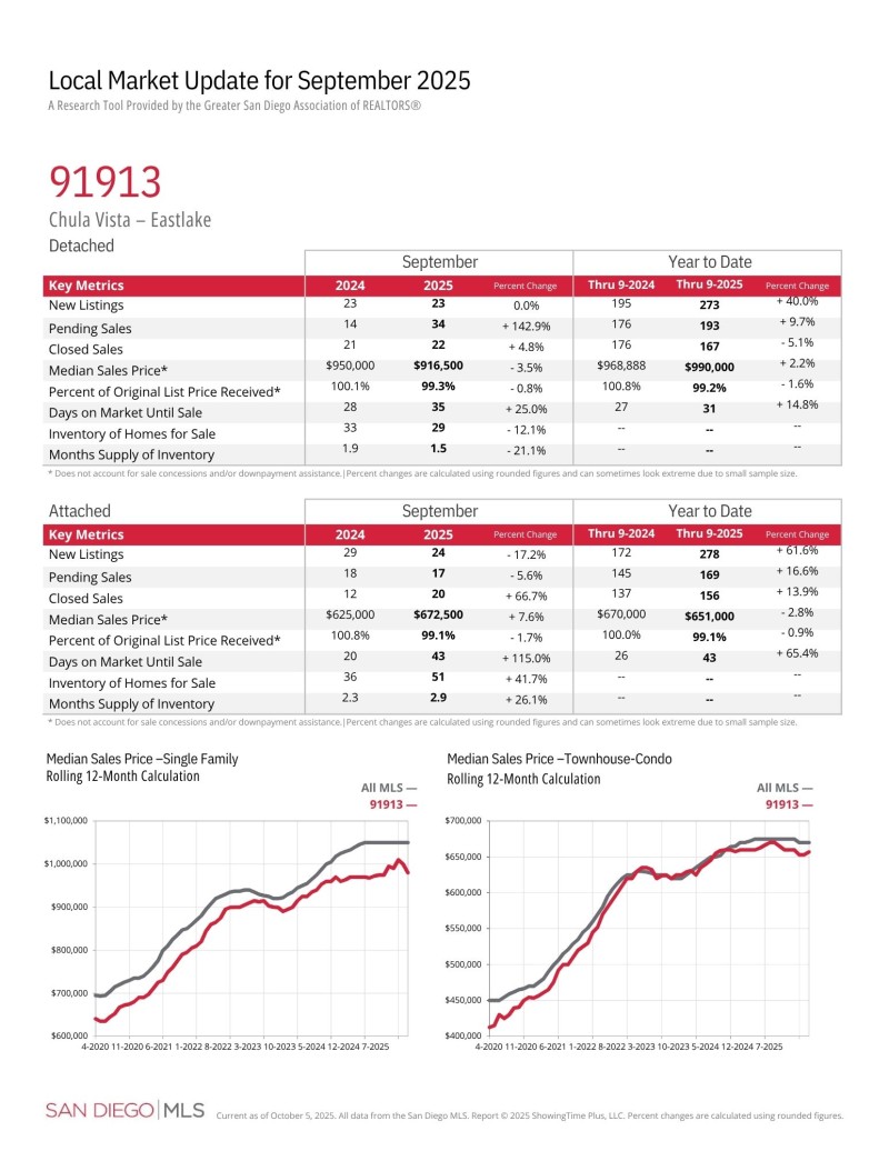 출라 비스타 동쪽지역 (Zip Code: 91913, 91915) 2025년 9월달 마켓 업데이트 입니다.