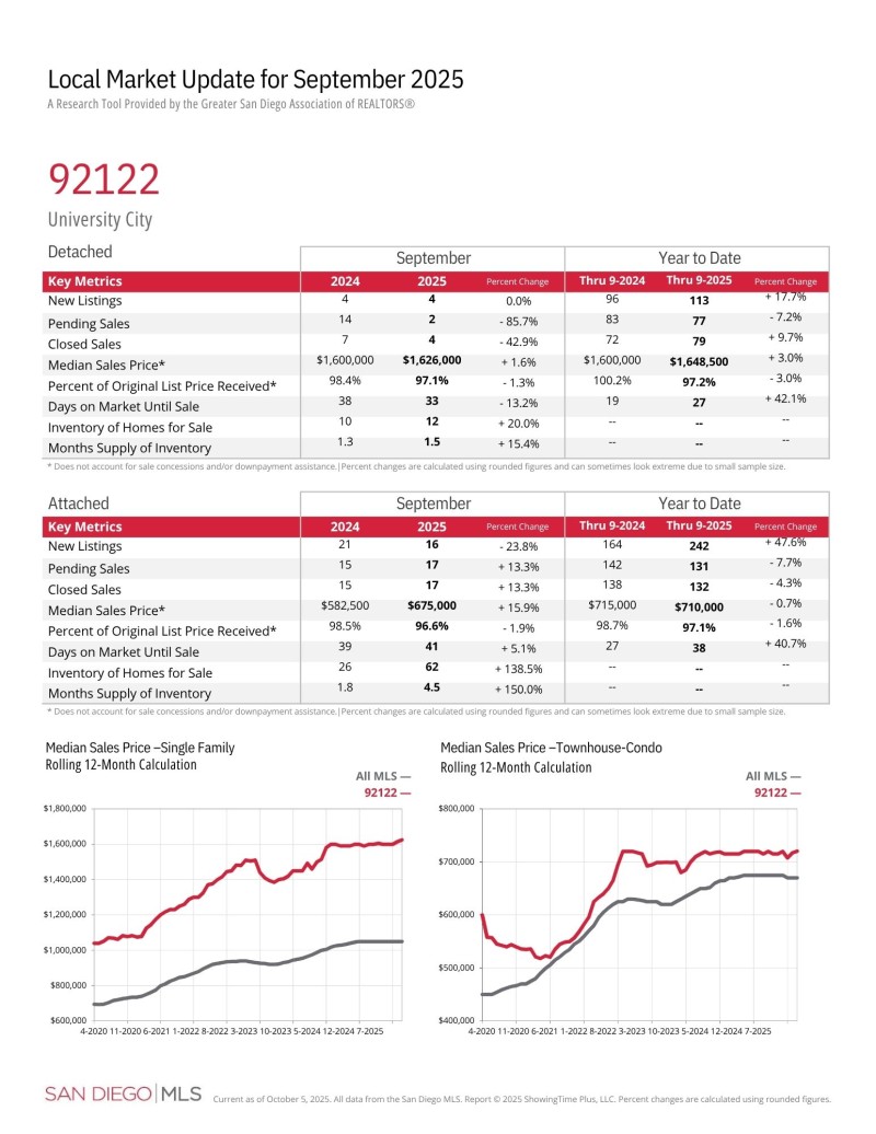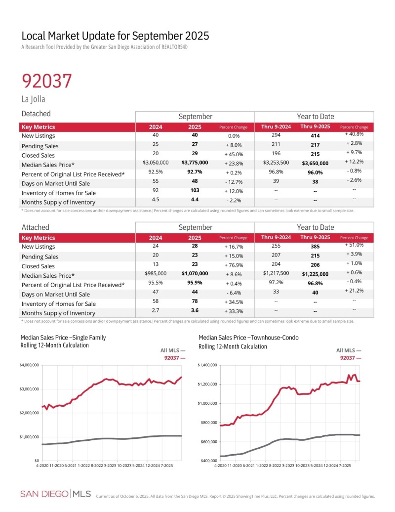 라호야지역 (Zip Code: 92037 & 92122- UTC지역 포함) 2025년 9월달 마켓 업데이트 입니다.