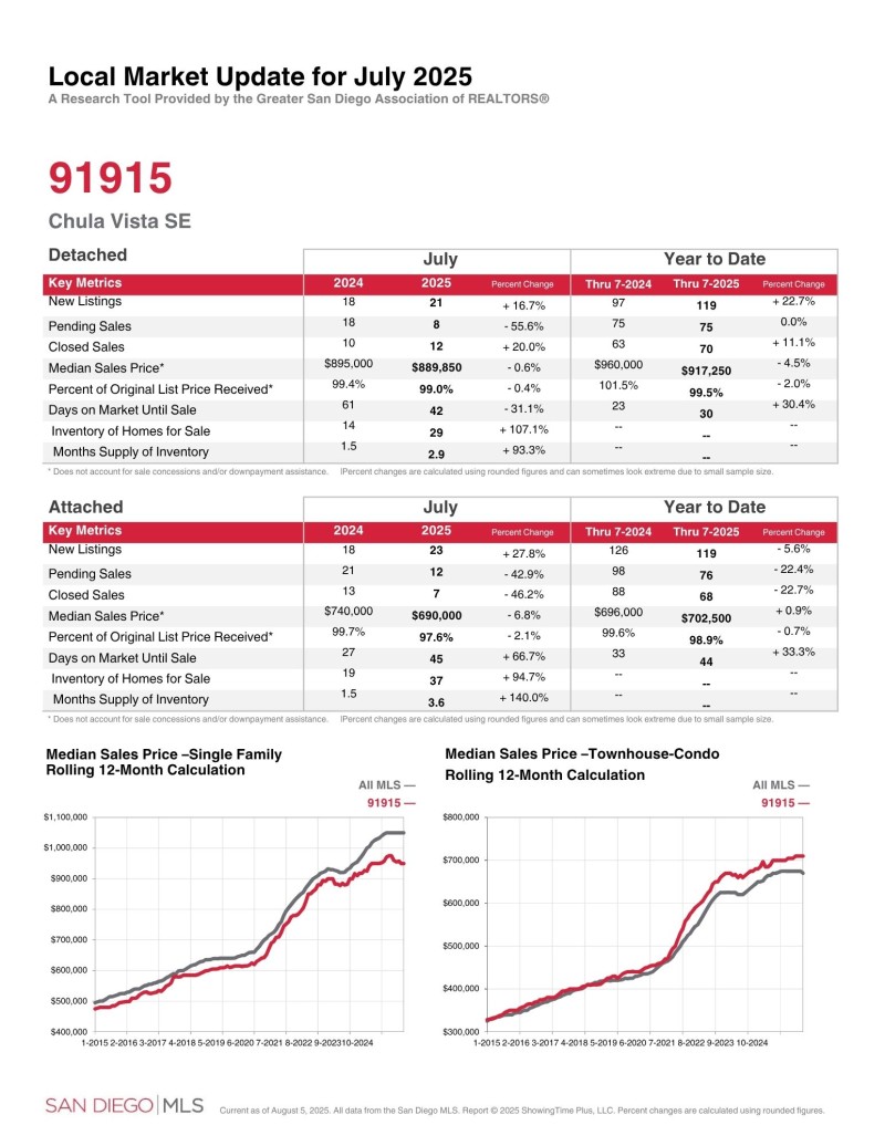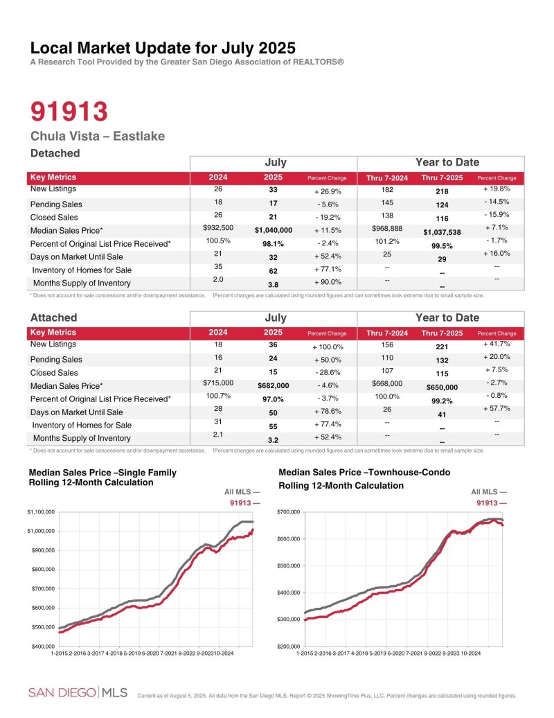 출라 비스타 동쪽지역 (Zip Code: 91913, 91915) 2025년 7월달 마켓 업데이트 입니다.