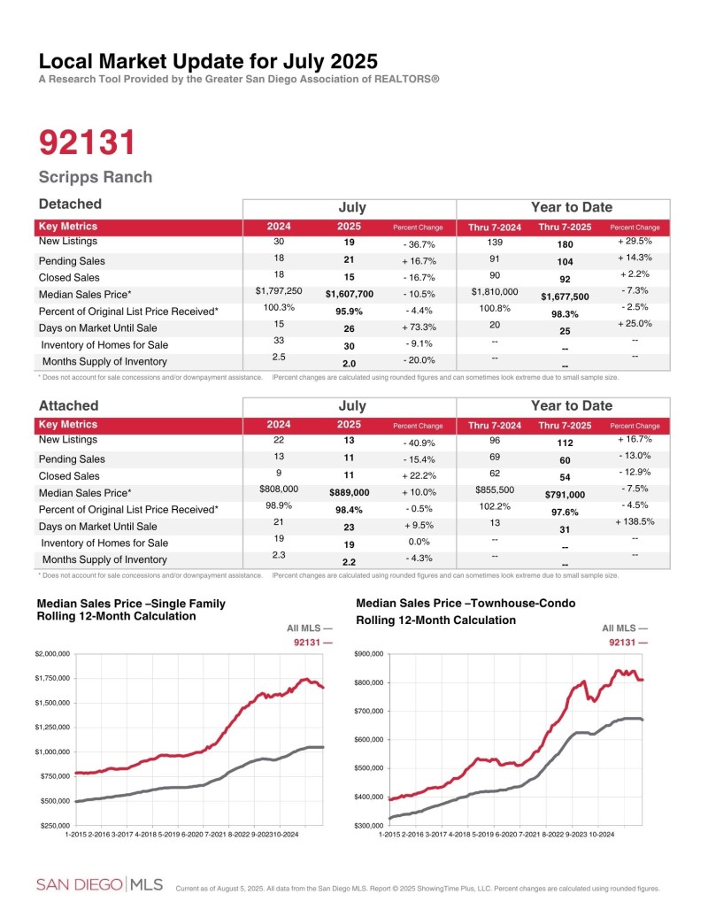 스크립스 랜치 (Zip Code: 92131) 2025년 7월달 마켓 업데이트 입니다. 1년 전과 비교했을 때 새로운 매물 수는 늘었고 가격이 하락했습니다.