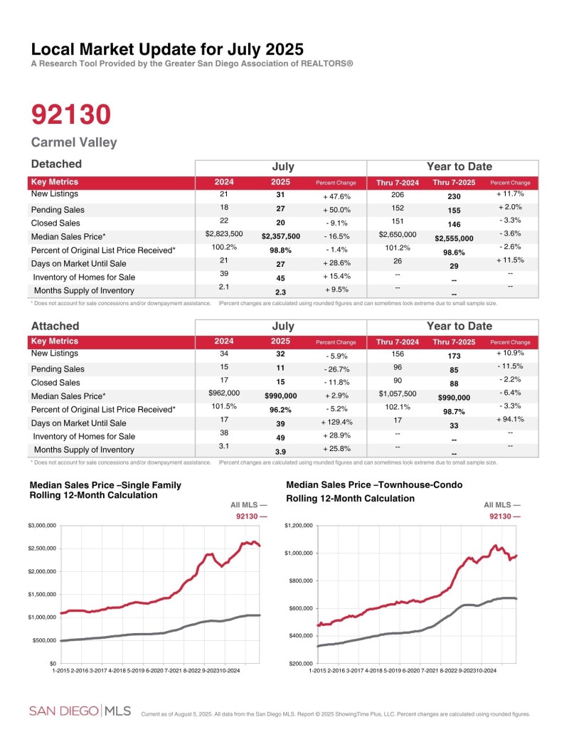카멜 밸리 (Zip Code: 92130) 2025년 7월달 마켓 업데이트 입니다.