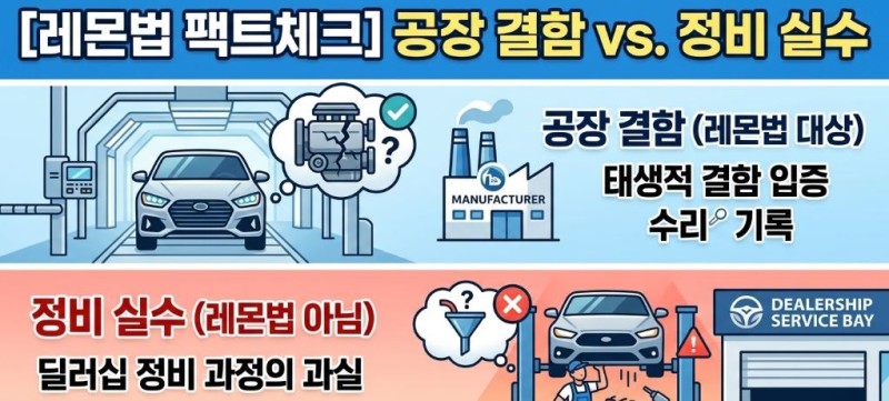 "멀쩡하던 차였는데, 딜러십에 엔진 오일 갈러 다녀온 후부터 차에서 이상한 소리가 나고 고장이 납니다. 레몬법으로 환불받고 싶어요!" 상담을 하다 보면 정말 자주 듣게 되는 질문입니다. 결론부터 확실하게 말씀드리면, 이 경우는 레몬법 대상이 아닙니다. 오늘은 일반 소비자들이 가장 헷갈려하시는 정비사의 과실과 차량 자체의 결함, 이 두 가지의 결정적인 차이점을 명확히 짚어드립니다.