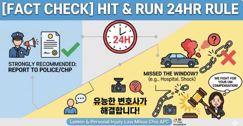 (캘리포니아 보험법은 뺑소니 사고 시 UM 보상을 위해 24시간 내 경찰 리포트를 규정하고 있으나, 블랙박스 영상이나 제3자 목격자의 진술 등 객관적이고 독립적인 증거가 확실하게 확보된 경우, 경험 많은 변호사를 통해 피해자의 보상 권리를 입증하고 구제받을 수 있습니다.)
