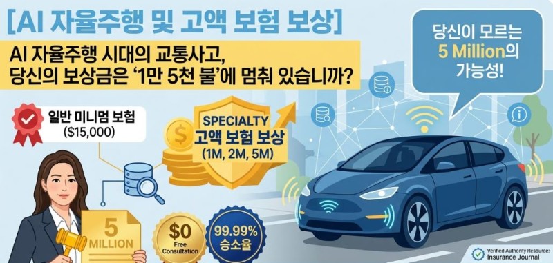 AI 시대의 교통사고는 기계적 결함, 소프트웨어 오류, 그리고 고액 스페셜티 보험의 존재 여부까지 파헤쳐야 하는 고도의 전략 싸움입니다. 상대방 차량이 AI 기술을 사용 중인지, 가해자가 고액의 추가 보험(Umbrella)을 가지고 있는지 끝까지 추적하는 변호사를 만나야 합니다. 이 정보를 알고 대응하느냐 아니냐에 따라, 여러분이 받는 보상금은 수천 불에서 수백만 불로 바뀔 수 있습니다.