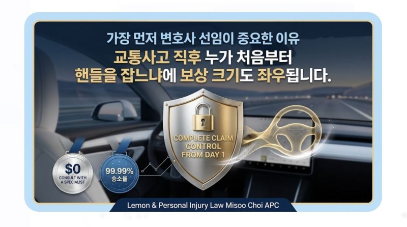 안녕하세요, 교통사고 상해 전문 최미수 변호사 법률 사무실입니다. 교통사고가 발생하면 당황한 마음에 가장 먼저 보험사에 전화를 거는 분들이 많습니다. 하지만 냉정하게 말씀드리면, 이는 내 보상금을 깎을 수 있는 가장 위험한 행동 중 하나입니다. 사고 보상의 성패는 누가 사고 직후부터 핸들(주도권)을 잡고 클레임을 컨트롤하느냐에 달려 있기 때문입니다.